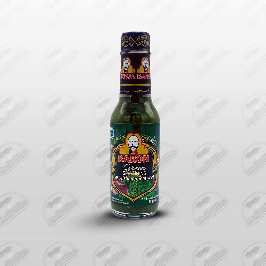 St. Lucia’s traditional classic green sauce is the flavour of the tropics. Baron’s Green Seasoning originates from St. Lucia. Green seasoning is used many different ways in Caribbean cooking, though its magical talents as a marinade are what draw most people to it. A grilled steak soaked overnight in this stuff yields an amazing spicy flavour that will put you right back in the region with one bite. Onion, garlic, thyme, salt, and vinegar are among the core ingredients found in green seasoning. Baron brand is chunkier than many other green seasonings, with bits of celery and onion plainly visible.